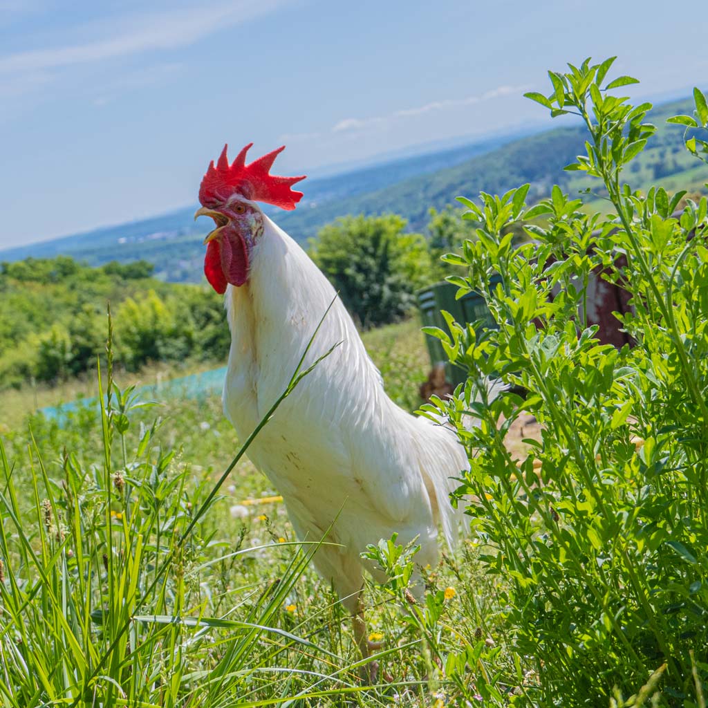 Die Tierhaltung auf unserem Hof steht für artgerechte Bedingungen für Nutztiere. Unsere Hühner und Hähnchen haben reichlich Platz im Freiland und können durch unsere Hühnermobile immer wieder neue Standorte kennenlernen. Dabei verzichten wir auf den Einsatz von Antibiotika und setzen auf natürliche Heilmethoden. Unsere Mutterkuhherde wird im Frühjahr aus dem gemütlichen, großzügig angelegten Stall auf die saftigen Weideflächen getrieben und kann dort bis zu den späten Herbstmonaten grasen. Der Schweinestall verfügt über einen großzügigen Innen- und Außenbereich. Er wurde sogar mit der Heinz-Merkel-Plakette ausgezeichnet.